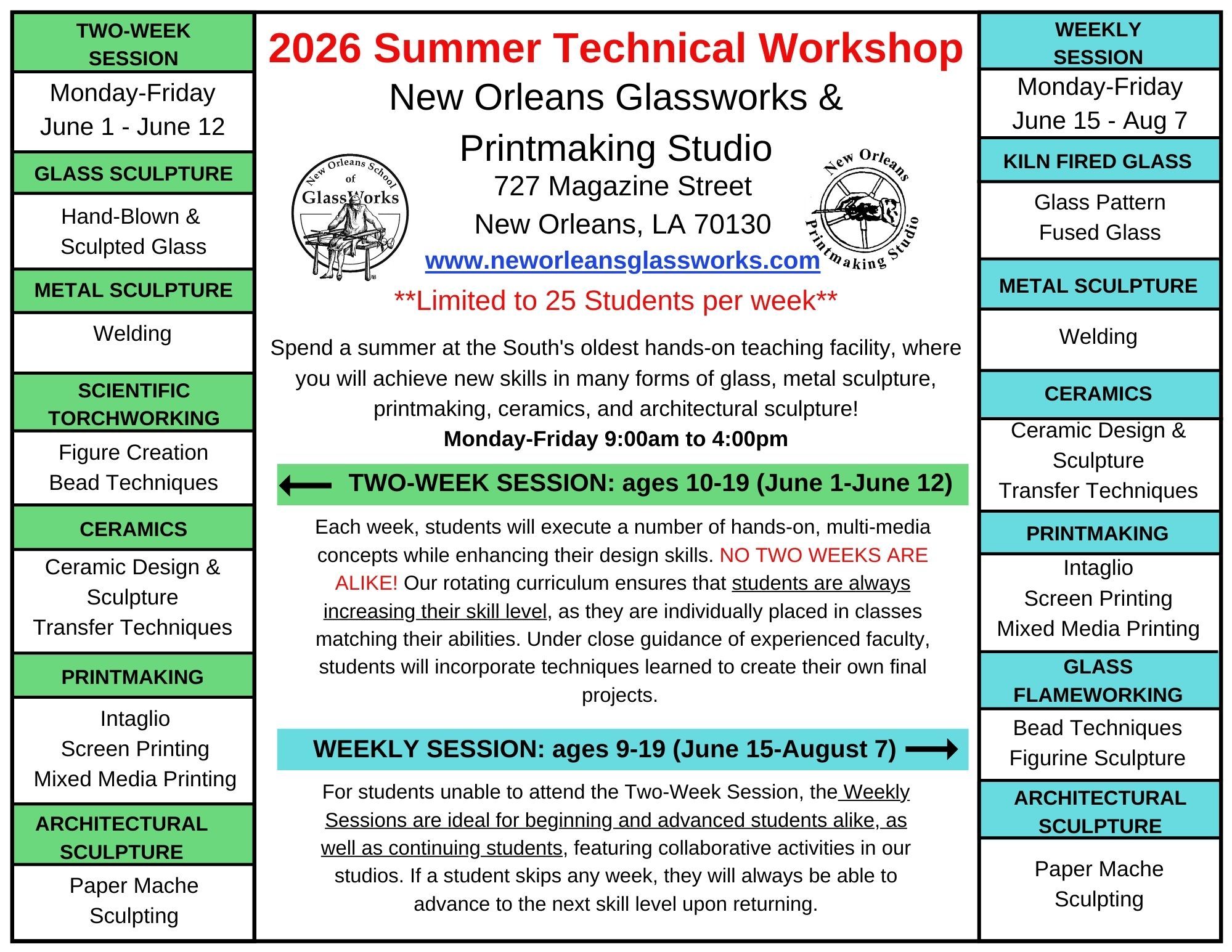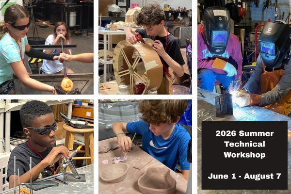 The Two-Week Session (ages 10-18) will run from June 1-12. The Two-Week Session features Glassblowing (furnace glass), Metal Sculpture (welding), Torchworking (glass), Mosaics, Ceramics, and Architectural Sculpture.